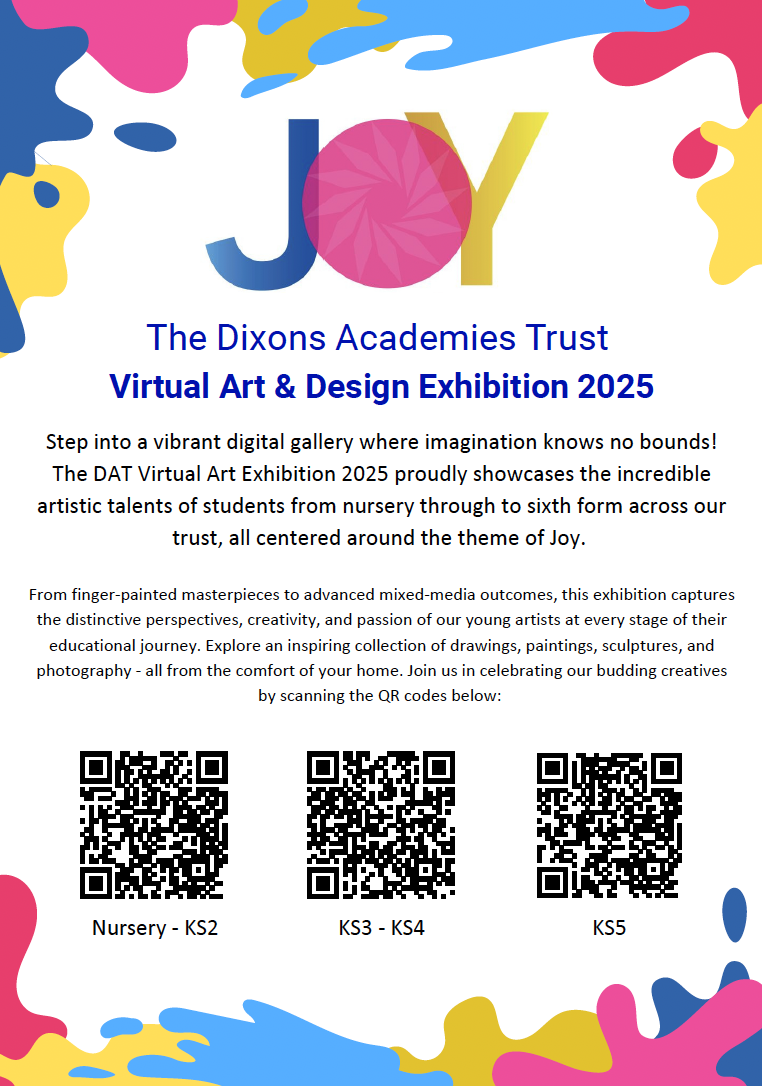Our 2025 virtual art exhibition proudly showcases remarkable artistic talent of students from nursery to sixth form, all inspired by one of our trust’s big moves: joy.